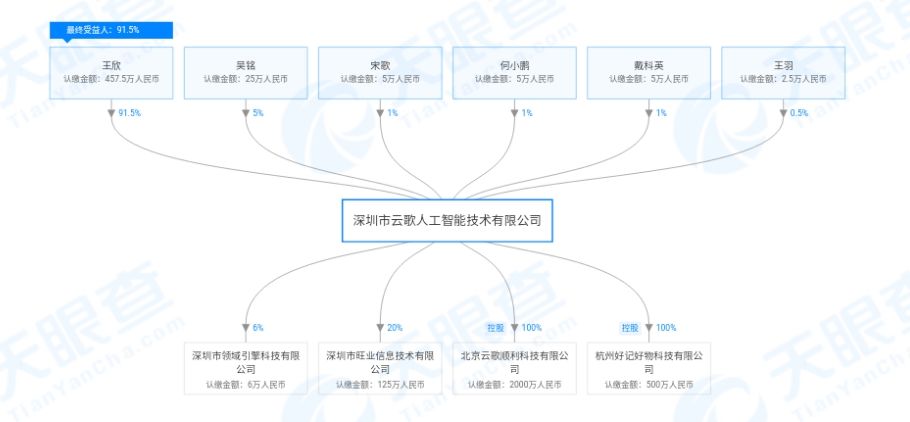 在告别快播之后,王欣开展了新的布局方向——人工智能和区块链,这也是当下最为火热的领域。天眼查显示,2018年2月26日,王欣持股91.50%的深圳云歌人工智能技术有限公司正式成立,注册资本500万,法定代表人为王欣的妻子彭鹏。原快播事业部总经理吴铭、小鹏汽车董事长何小鹏等人在公司中也象征性持有少数股份。