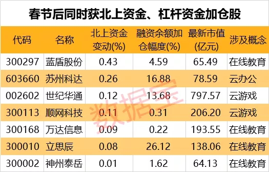 苏州科达获北上资金加仓0.26个百分点,杠杆资金加仓16.88%,公司自2011年起做云视频会议,拥有成熟的云MUC和技术,“云”理念贯穿科达,公有云、私有云或者公私混合的混合云,可以由用户自由选择。世纪华通、顺网科技获北上资金加仓均超过0.1个百分点,杠杆资金分别加仓13.68%、0.31%。