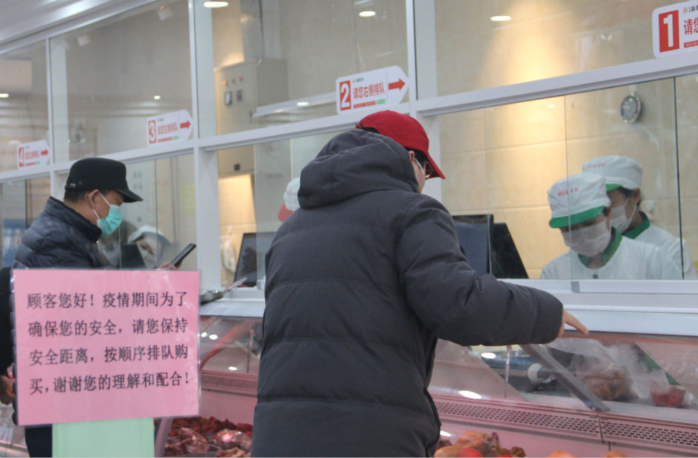 特殊时期,既要让顾客买到喜爱的食品,又要尽全力保障顾客到店安全,北京稻香村的师傅们都是提前将酱卤类产品用保鲜膜包好,独立包装的产品更加方便,也减少了顾客的等待时间。此外,熟食柜台前也拉起了疏散客流的隔离带,并有工作人员专门负责疏导顾客,间隔一米、有序购买。