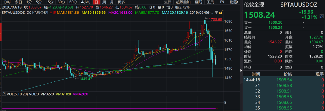 3月18日,黄金继续下跌,截至发稿前,伦敦金报价跌破1500美元/盎司。
