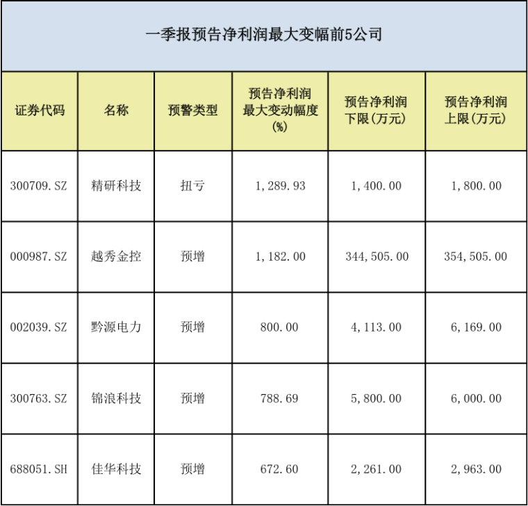 其中,精研科技(300109)预计净利润最大增幅为1289.93%,越秀金控(000987)预计净利润最高增长1182%。黔源电力(002039)、锦浪科技(300763)、佳华科技(688051)均预计净利润最高增超600%,分别为800%、788.69%和672.6%。