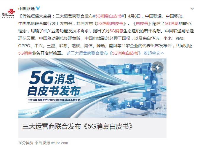 据中国联通官方微博消息,4月8日,中国联通、中国移动、中国电信联合举行线上发布会,共同发布《5G消息白皮书》。《白皮书》阐述了5G消息的核心理念,明确了相关业务功能及技术需求,提出了对5G消息生态建设的若干构想。