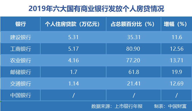 2019年,五大国有商业银行发放的个人住房贷款总额为17.48万亿元(中国银行未发布相关数据),较2018年增长13.21%。