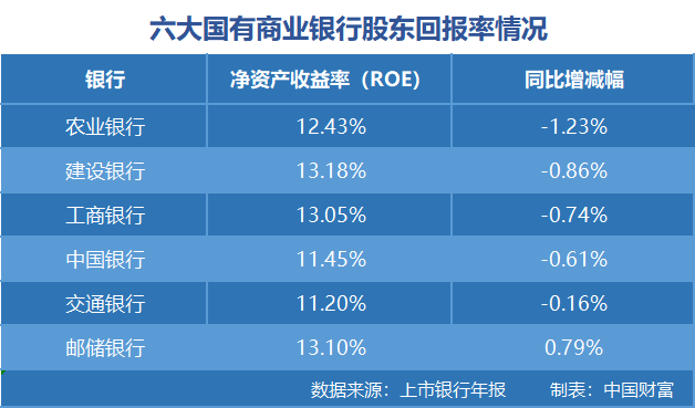 赚钱厉害,并不代表股东权益回报率也高。从净资产收益率(ROE)指标来看,以六大国有大行为例,建设银行最高,为13.18%,邮储银行、工商银行紧随其后,分别为13.10%和13.05%。