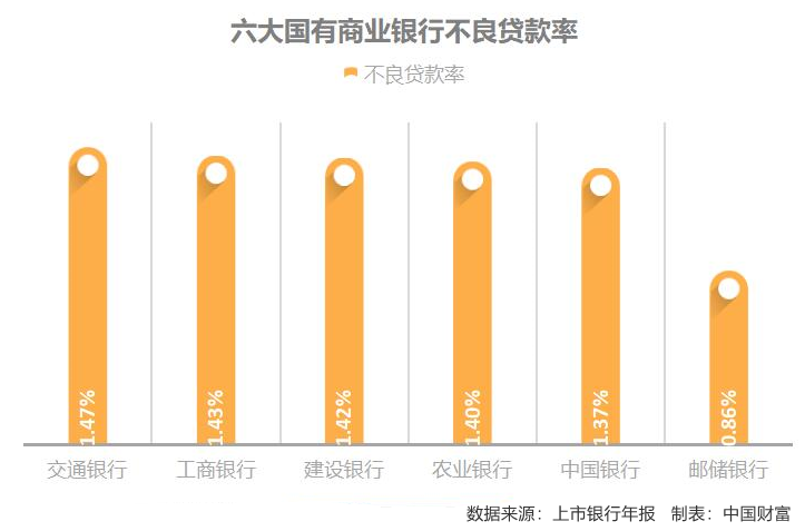在GDP增速下降的环境下,银行资产也是多方关注的焦点。2019年,受到流动性宽松的政策支持,商业银行的经营环境得到了明显改善,各行加大了对不良资产的处置力度,不良贷款率多未出现上升,以六大国有银行为例,均保持在低于1.5%的水平。