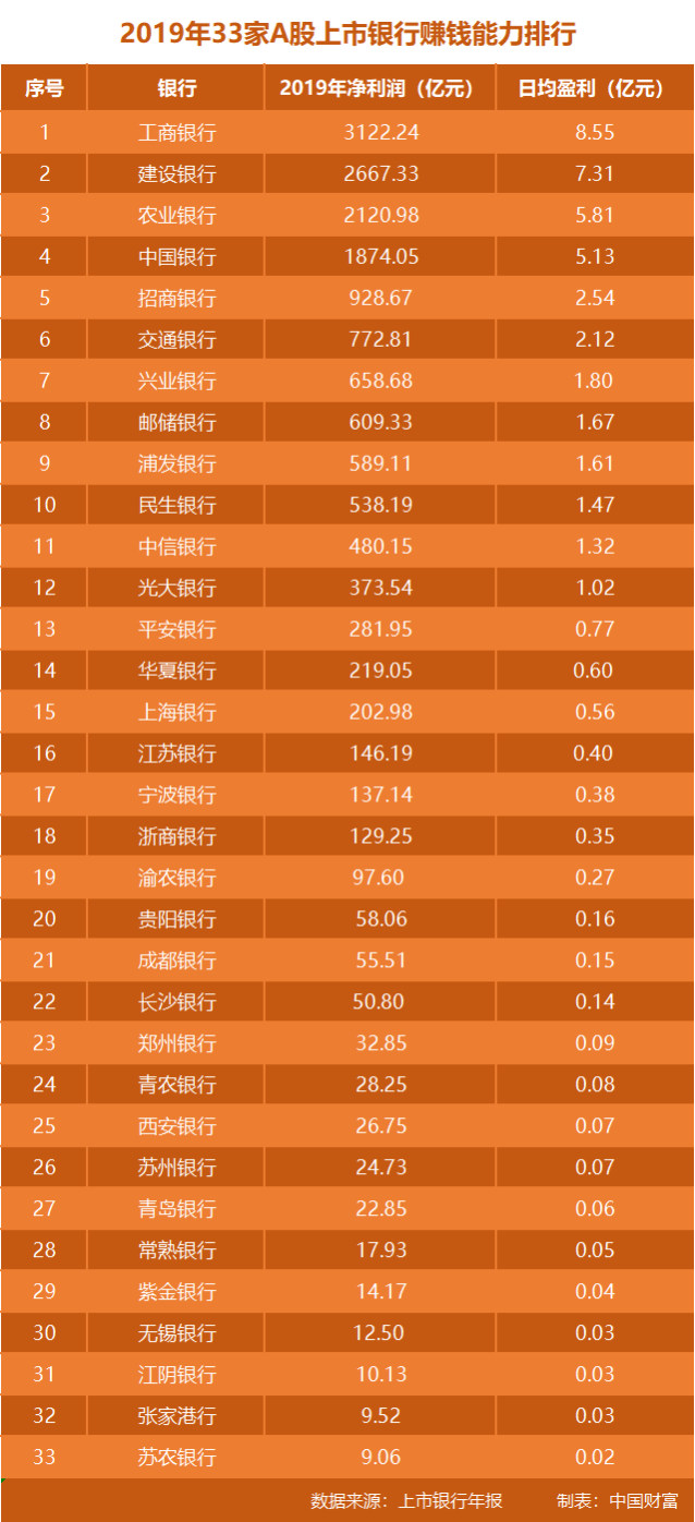 日均盈利超过1亿元的上市银行共有12家,包括6家国有大行与6家全国性股份制银行。不过,也有11家中小银行的日赚金额不足0.1亿元,其中,日均盈利最少的是苏农银行,仅为0.02亿元。由此可以看出,上市银行的盈利能力分化明显。