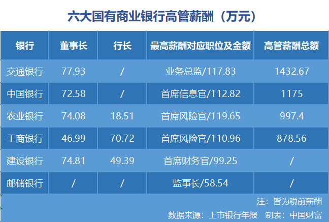 高管薪酬方面,根据六大国有银行披露的年报数据,董事长薪资最高的为交通银行,税前年薪77.93万元;行长薪资最高的为工商银行,税前年薪70.72万元。
