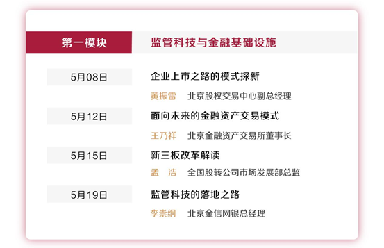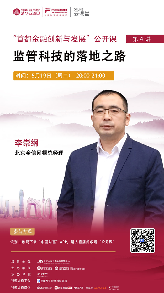 5月19日(周二)20:00-21:00,由北京市地方金融监督管理局指导,清华大学五道口金融学院、清华大学金融科技研究院主办,未央网承办的“首都金融创新与发展”公开课第四讲,将由北京金信网银总经理李崇刚为大家带来“监管科技的落地之路”主题分享。欢迎扫描海报二维码下载“中国财富”APP参与。