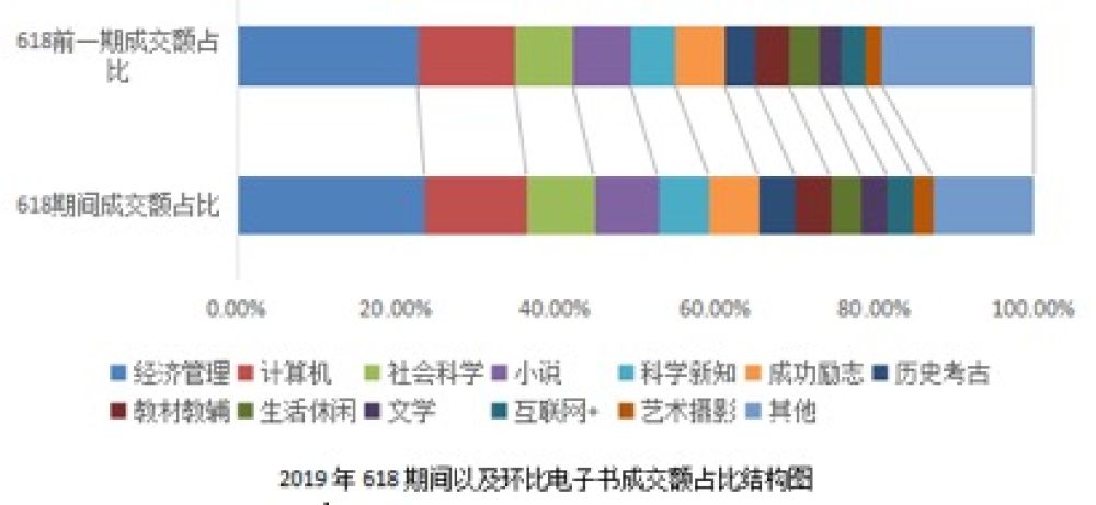2019年618期间,无论是专业类细分市场还是大众休闲类市场电子书成交额占比均有提升。通过电子书成交额占比结构图可以看出,与纸质书细分类成交额占比较大的为童书和小说类不同,电子书市场成交额占比较大的前三名均是专业类图书细分类,分别是经济管理、计算机和社会科学类。互联网的日新月异也推动着电子阅读的蔚然成风,便携、高效的优势也使其更受到快节奏职场人士的青睐。
