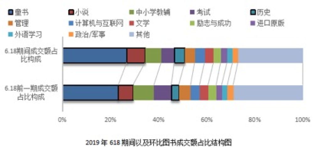 以2019年为例, 618前一期,成交额占比前三分别是童书、中小学教辅、考试。618期间,童书、小说、中小学教辅的成交额占比位居前三,且童书和小说类成交额较618前一期成交额占比增加明显。而成交额位列第3和第4的中小学教辅和考试类环比都有所下降。位列第5名的历史类在618期间的成交额占比也有明显的增加。