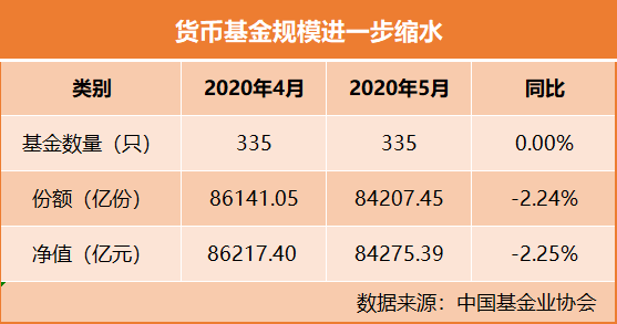 收益率快速下降的同时,货币基金也在逐渐失去对投资者的吸引力。中基协数据显示,5月,货币市场基金资产净值为84275亿元,环比减少2.25%。