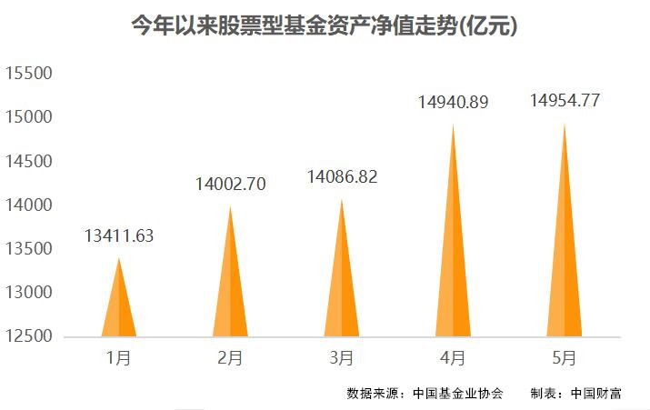 权益类基金的规模也随之水涨船高,以股票型基金为例,中基协数据显示,其资产净值持续上涨,相较1月份已扩张约11.5%。截至5月末,全市场股票基金资产净值为14954.77亿元,混合基金资产净值为24112.26亿元。