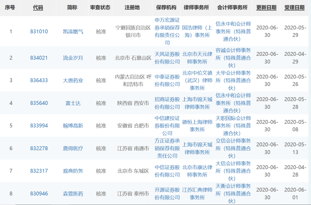 同时,6月30日晚,又有凯天燃气、流金岁月、大唐药业、富士达、翰博高新、鹿得医疗、观典防务、森萱医药8家公司获得证监会同意核准,经过精选层挂牌委员会审议通过的30家公司中,24家公司获得核准,没有不同意核准的情况出现。
