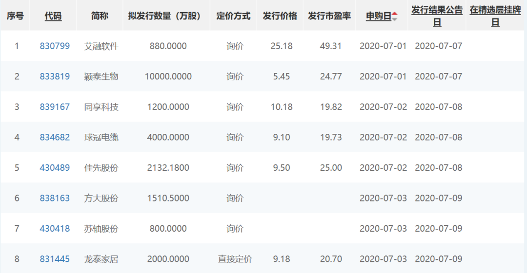 6月30日,同享科技、球冠电缆、佳先股份分别发布了询价结果,确定了发行价格分别是10.18元、9.10元、9.50元,发行市盈率分别为19.82倍、19.73倍、25倍,龙泰家居业发布了直接定价结果9.18元,发行市盈率20.70倍。