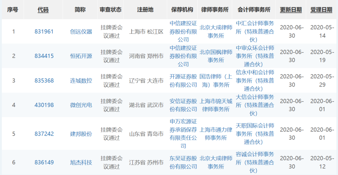 根据6月30日晚股转系统挂牌委员会第13次、14次和15次审议会议结果,旭杰科技、建邦股份、微创光电、连城数控、恒拓开源、创远仪器六家公司的精选层挂牌申请均获得会议通过,唯有从事网络安全产品和服务的圣博润被暂缓审议。截至目前,获得挂牌委通过的公司累计达到30家。