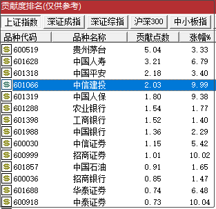 具体来看,在推动沪指大涨的前14个品种中,有包括中信建投、中信证券等5只个股的证券板块。此外,以贵州茅台、中国人寿、农业银行为代表的白酒、保险、银行板块也为沪指上涨做出了不少贡献。