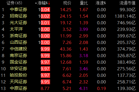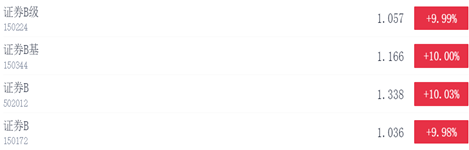 更夸张的是,一系列证券基金也随之涨停,证券B级(150224)、证券B基(150344)等带杠杆的证券行业基金涨停。资金纷纷追入证券行业,生怕自己动作慢了踏空,市场出现了牛市才有的火热气氛。