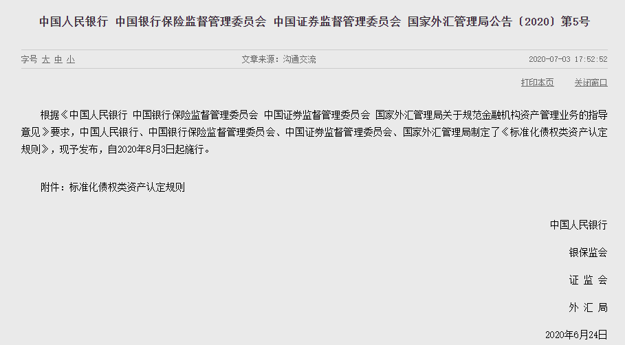 央行网站3日消息,中国人民银行会同中国银行保险监督管理委员会、中国证券监督管理委员会、国家外汇管理局正式发布《标准化债权类资产认定规则》(下称《认定规则》),自2020年8月3日起施行。