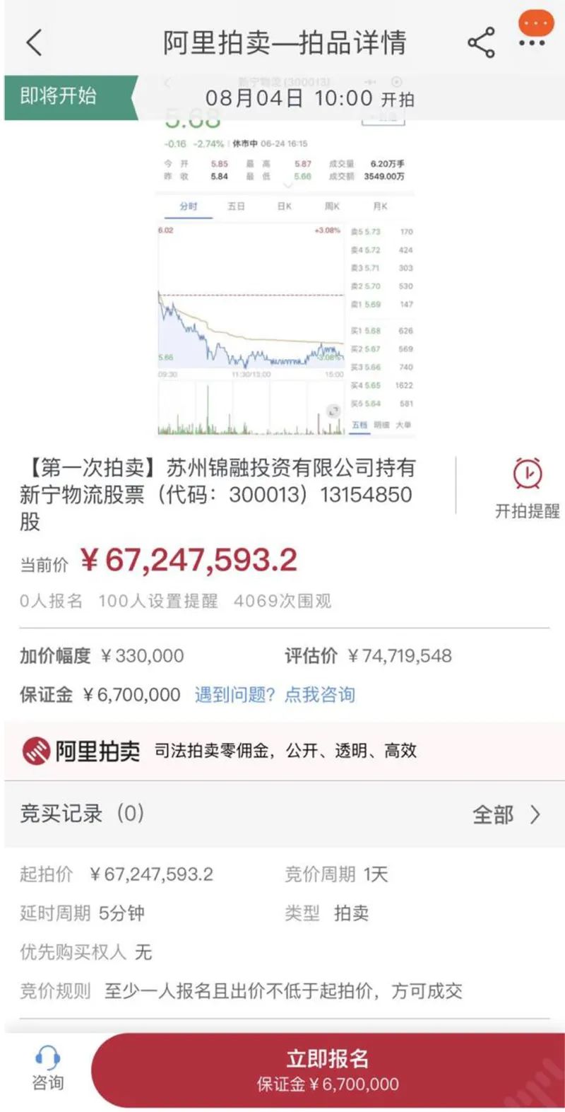 新宁物流日前公告,公司获悉广州市中院在“阿里拍卖·司法”发布了股权拍卖公告。而此次公开拍卖的对象,正是股东苏州锦融和曾卓分别持有的4635.75万股及67.99万股的公司股份。