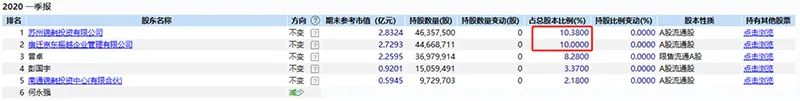 此话怎讲?来看看新宁物流今年一季度的股东榜,大股东苏州锦融持股比例为10.38%,“东哥”旗下的京东振越则以0.38%之差(持股比例)“屈居”二股东。