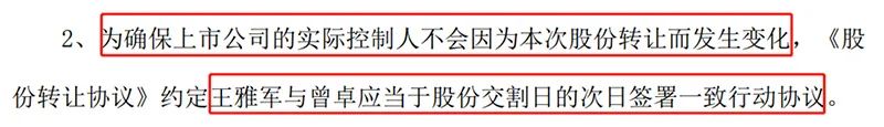值得一提的是,当时的股权投资协议公告中还专门设置了一项条款:为维护上市公司稳定性,苏州锦融大股东王雅军拟与曾卓签署《一致行动协议》,以此保持王雅军的公司实控人地位不变。