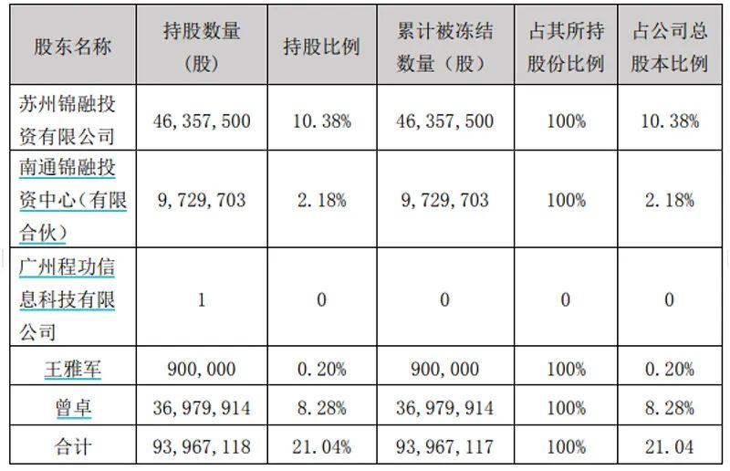 最新公告显示,苏州锦融、南通锦融、程功信息和实控人王雅军及其一致行动人曾卓合计持有公司股份9396.71万股,占公司总股本的21.04%;其中合计质押股份达99.86%,全部持股已被司法冻结及轮候冻结。