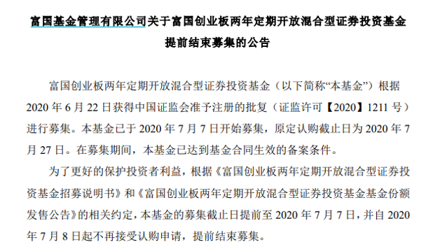 7月7日,首批3只创业板战略配售基金起售,其中,富国旗下的基金富国创业板两年定期开放基金率先逼近30亿规模上限而一日售罄。7月8日,富国基金公告称,该基金已提前结束募集。