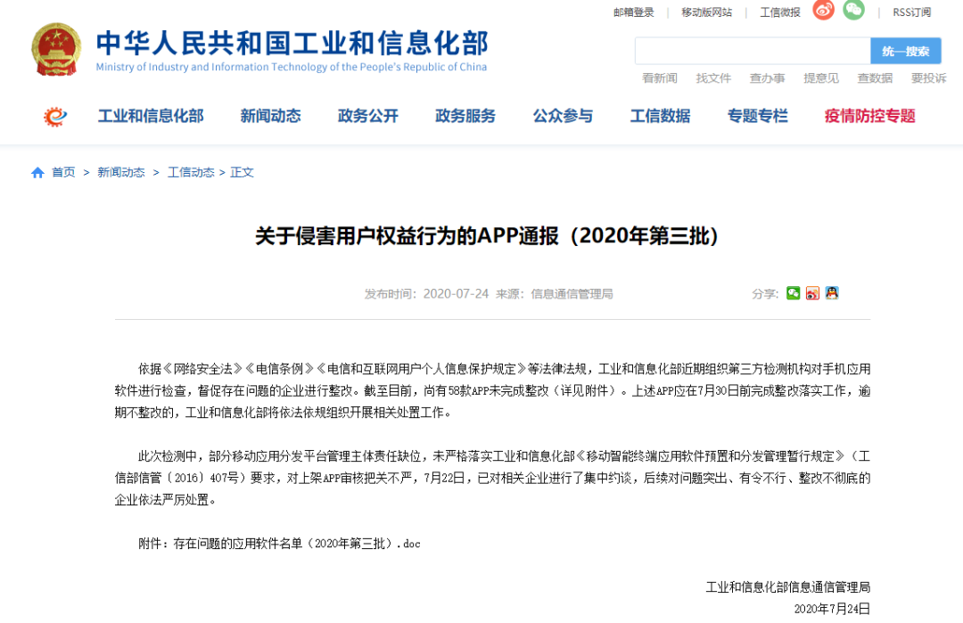 7月24日,工信部推出2020年第三批通报名单,共有58款APP因未完成整改而登榜。