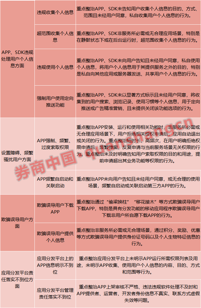 在整治对象上,除了传统APP外,还包括软件工具开发包(SDK)提供者以及应用分发平台。具体来看,共有四方面十项整治任务:
