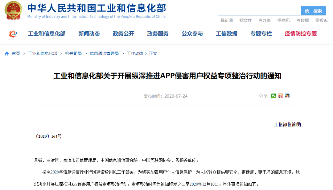 7月24日,工信部再次对APP安全进行强调,发布《关于开展纵深推进APP侵害用户权益专项整治行动的通知》。根据通知,专项整治时间为通知印发之日至2020年12月10日。