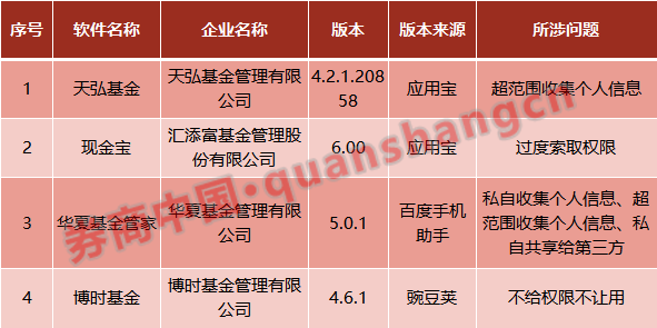 从问题上来看,华夏基金涉及私自收集个人信息、超范围收集个人信息、私自共享给第三方3项问题,天弘基金、汇添富基金、博时基金则分别涉及超范围手机个人信息、过度索取权限、不给权限不让用的问题。