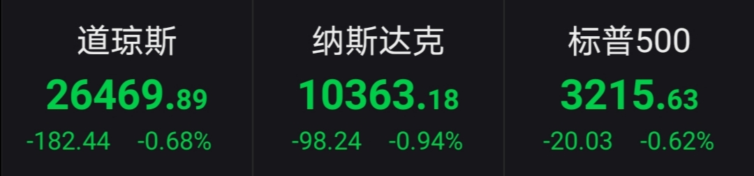 美国三大股指24日集体收跌。道指跌0.68%报26469.89点;纳指跌0.94%报10363.18点;标普500指数跌0.62%报3215.63点。