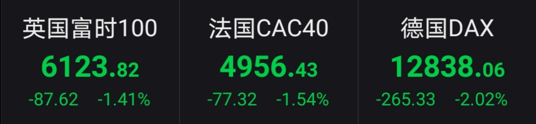 欧洲三大股指24日全线下挫。英国富时100指数跌1.41%报6123.82点,周跌2.65%;法国CAC40指数跌1.54%报4956.43点,周跌2.23%;德国DAX指数跌2.02%报12838.06点,周跌0.63%。