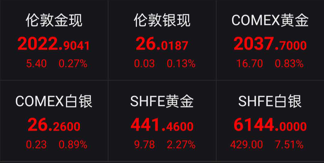 周三亚盘时段,现货金银延续前一天的强势表现,金价再次创造历史。现货黄金小幅低开后快速回升,成功上破2020美元关口,续刷历史新高。现货白银高开高走,涨幅扩大一度至逾1%,后收窄涨幅更一度转跌;纽约白银期货涨1.79%,报26.49美元/盎司。