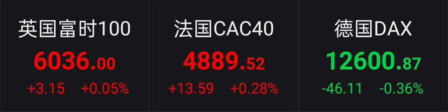 欧洲三大股指4日涨跌不一。英国富时100指数涨0.05%报6036点;法国CAC40指数涨0.28%报4889.52点;德国DAX指数跌0.36%报12600.87点。