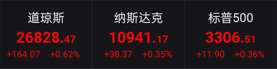 美国三大股指小幅收涨。其中,道指涨0.62%报26828.47点;纳指涨0.35%报10941.17点,再创新高;标普500指数涨0.36%报3306.51点。