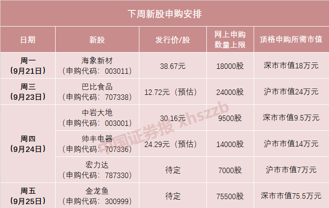 根据新股发行安排,下周A股将有6只新股申购,其中包括“巨无霸”金龙鱼。