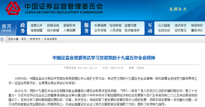 中国证监会分别召开党委会和党委理论中心组扩大学习会,传达学习党的十九届五中全会精神,研究部署全系统学习宣传贯彻工作。证监会党委书记、主席易会满主持会议并讲话。会议表示,要着眼于提高直接融资比重,加快完善多层次资本市场体系,以注册制和退市制度改革为抓手,全面加强资本市场基础制度建设。