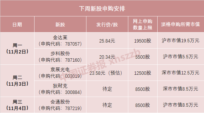根据新股发行安排,下周(11月2日至11月6日)A股将有5只新股申购,包括科创板3只、中小板1只、创业板1只。