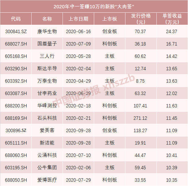 9月28日上市的沪市主板新股新洁能,也加入了“中一签赚10万”的新股行列。新洁能共收获了16个一字连板,若按照开板日(10月28日)收盘价计算,中一签新洁能可赚11.09万元。因此,新洁能也成为了今年以来上市的第13只“中一签赚10万”的新股。