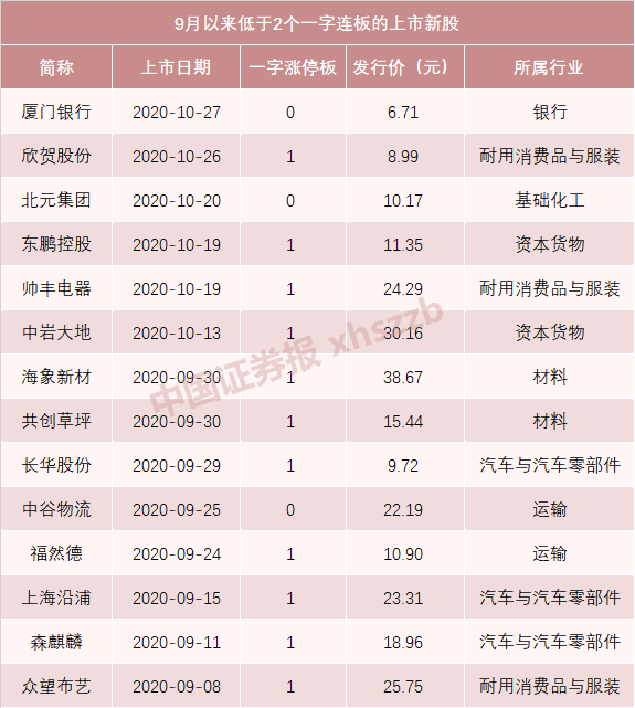 10月27日上市的沪市主板新股厦门银行,上市首日就打开了涨停板,收盘涨幅为40.24%。此前,10月20日上市的北元集团和9月25日上市的中谷物流,也都在上市首日开板。在9月以来上市的非注册制新股中,还有11只新股在上市次日开板。