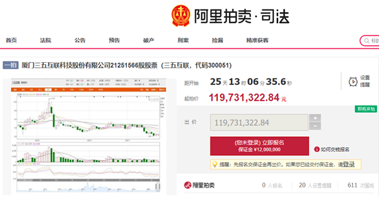 目前,淘宝网的阿里司法拍卖页面上可以看到该条拍卖信息。详情显示,该笔拍卖起拍价格接近1.2亿元,换算成股价约为5.6元,较11月30日三五互联收盘价存在9%左右的折价空间。