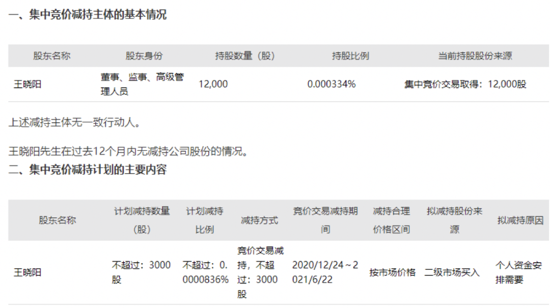 12月2日晚间,出现了本文开头所写的让人“摸不着头脑”的减持公告——“公司监事王晓阳先生本次拟减持其持有的公司无限售流通股不超过3000股。减持期间为自本公告之日起十五个交易日后的6个月内(窗口期不减持)。减持价格视市场价格确定。”