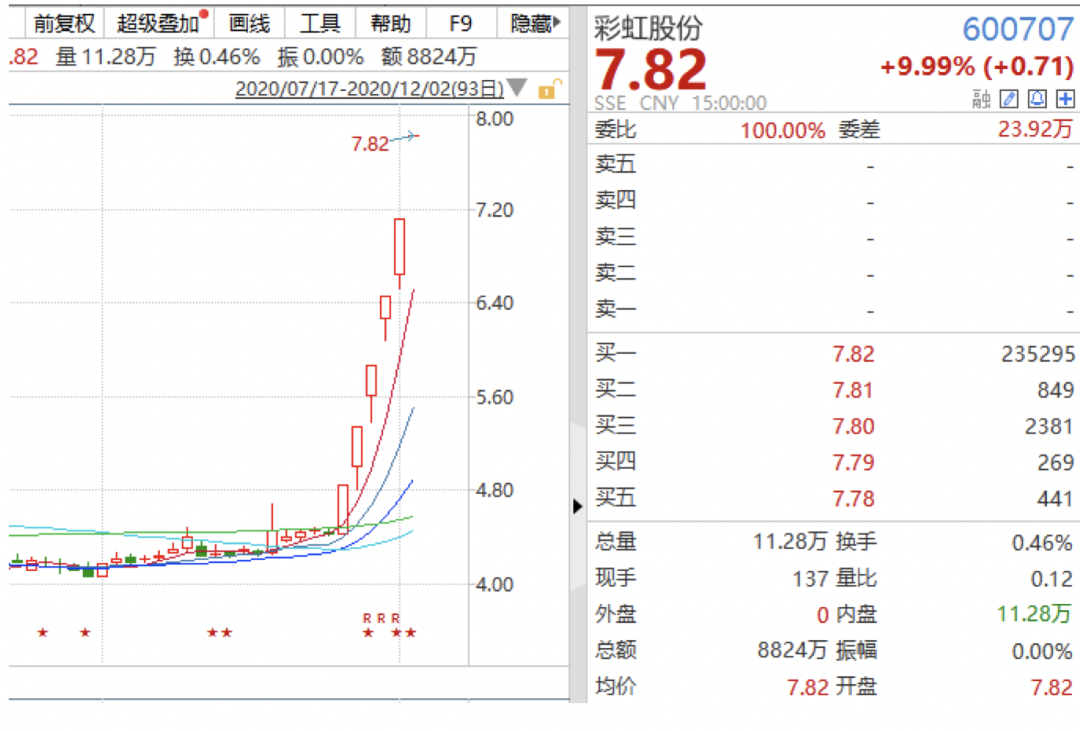 12月2日,彩虹股份开盘一字涨停,股价报7.82元,截至收盘,涨停价格上还有23.5万手买单排队等候。