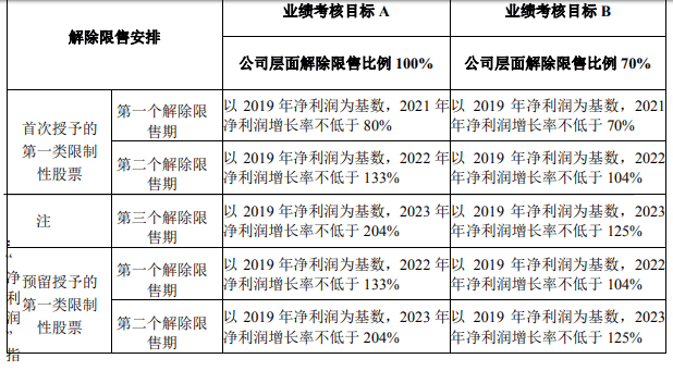 不过,其股权激励也有更为严苛的业绩考核条件。公告显示,蓝特光学共设置两种业绩考核方案,以公司层面解除限售比例100%这个指标看,该指标以2019年净利润为基数,解锁条件为2021年至2023年净利润增长率分别不低于80%、133%和204%。