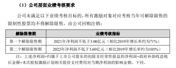 具体来看,在行权条件方面,公司层面以2019年的净利润为基础,2021年至2022年考核净利润分别不低于3亿元、3.6亿元。上述解锁业绩条件相当于其2021年和2022年净利润较2019年分别增长不低于71%、105%。同时,公司还对子公司层面和个人绩效考核做出要求,满足三项考核后,激励对象方可“落袋为安”。