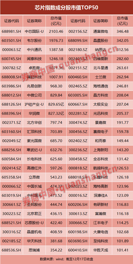 受到上述消息影响,12月17日午后,港股软件服务板块和半导体板块集体拉升。截至收盘,华虹半导体大涨7.36%,中芯国际港股由跌转升,收盘上涨3.71%。恒生科技指数尾盘也现拉升,收盘上涨2.29%。据wind数据,按照市值排序,A股芯片指数成分股市值前50为以下公司: