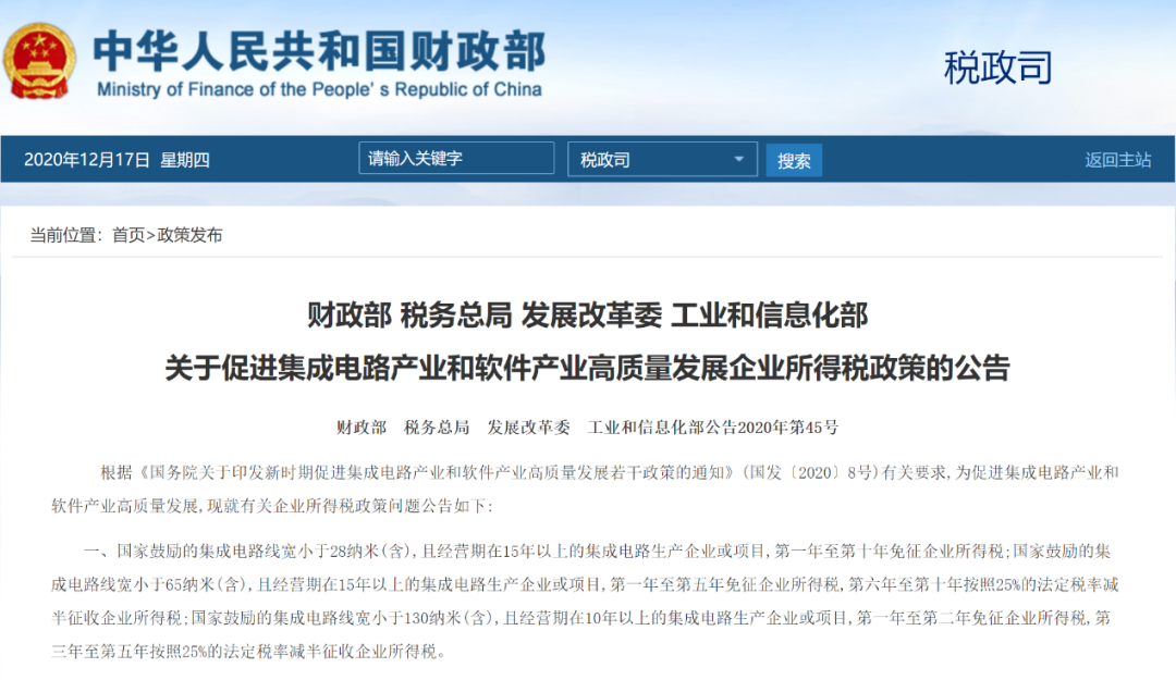 12月17日,财政部、税务总局、发改委、工信部联合发布《关于促进集成电路产业和软件产业高质量发展企业所得税政策的公告》(下称《公告》),进一步明确国家鼓励的集成电路企业和软件企业的企业所得税减免政策。