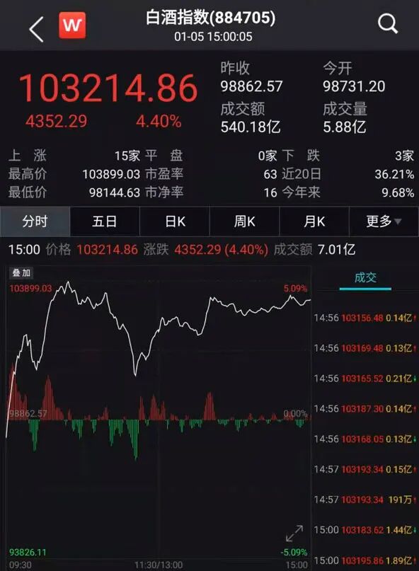 1月5日当天,Wind白酒指数全天收涨4.40%,成交额达540亿元,成分股中仅三家公司下跌。