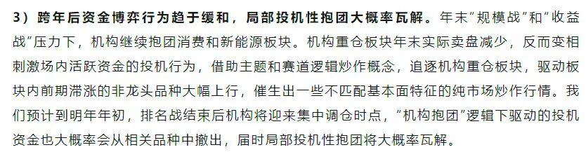 日前,中信证券策略团队发布研报称,岁末年初的多重扰动预计会导致市场局部投机性抱团瓦解。一方面,海外疫情可能冲击部分前期市场博弈的“疫情受损股”修复行情;另一方面,跨年后机构资金博弈行为趋于缓和,局部投机性抱团大概率瓦解。